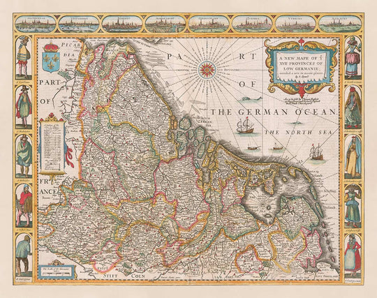 Alrededor del borde del mapa son hermosas viñetas de los ciudadanos de los países bajos, y vistas detalladas de las principales ciudades como Amsterdam, Amberes y Utrecht.