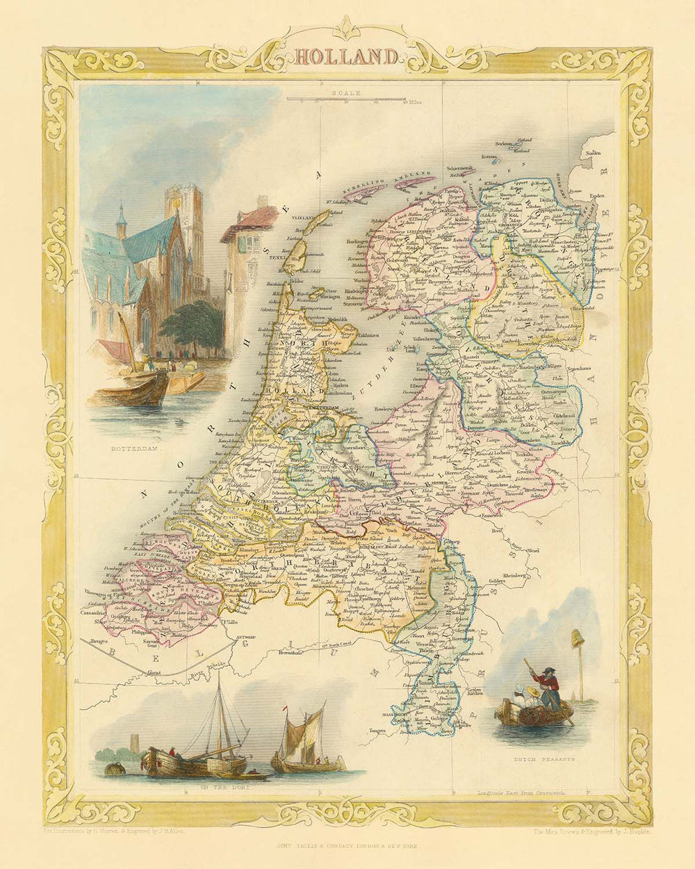 John Tallis, celebrated as one of the last great decorative mapmakers, was revered for his ability to blend meticulous cartographic detail with the allure of fine art. His works are prized for their ornate borders and the inclusion of charming vignettes that breathe life into the landscapes they depict. In "Holland," Tallis brings together the political and physical geography of the Netherlands, demarcating provincial borders and highlighting the intricate network of rivers, canals, and lakes that define the Dutch landscape.