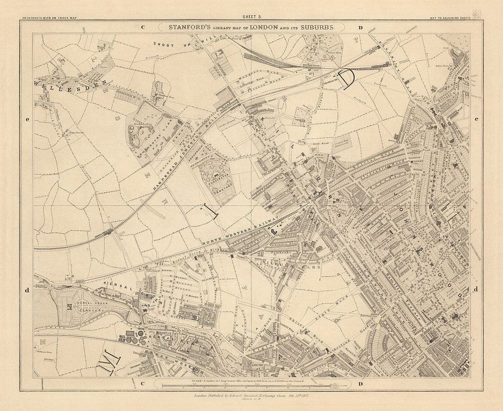 El mapa fue publicado originalmente en 24 hojas. En total, el mapa habría medido aproximadamente 2 metros de ancho (78 pulgadas). Este aquí es la hoja 5, que se centra en las áreas de Londres oeste y noroeste de St Johns Wood y Kilburn.