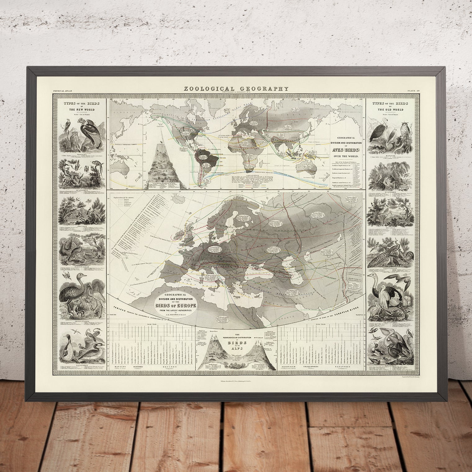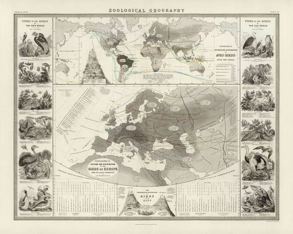 Zoological Geography, issued by Alexander Keith Johnston, F.R.G.S., in 1856, is a consummate Victorian union of science and art. Conceived as the second edition of a pioneering plate first published in 1848, it channels the mid-19th century’s new ambition to map life itself. Johnston translates the burgeoning discipline of zoological geography into a global portrait of avifauna, tracing where birds live—and why—across climates and continents. The plate’s thematic focus rests on the world’s birds, set against a disciplined geographic scaffold that makes patterns of distribution legible at a glance. In an age poised on the threshold of modern biogeography, Johnston’s work distilled scattered observations into a lucid, continent-spanning narrative.