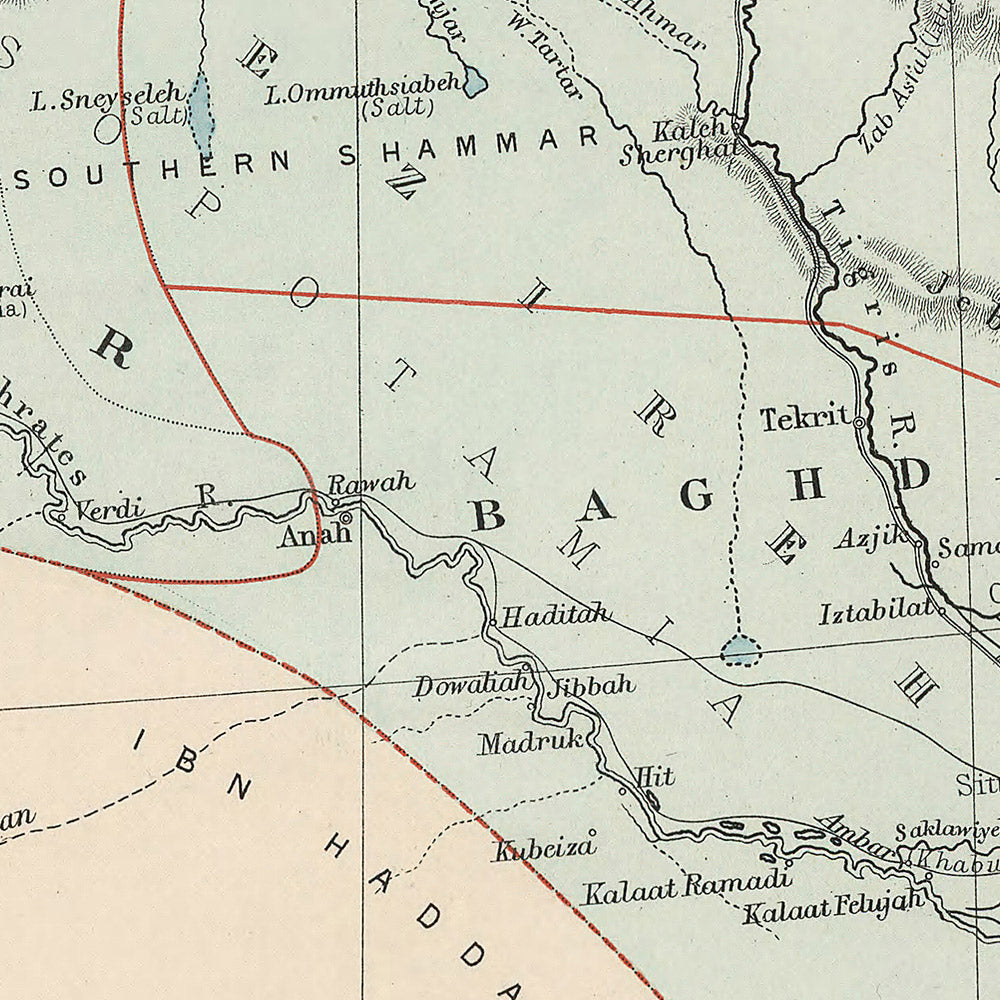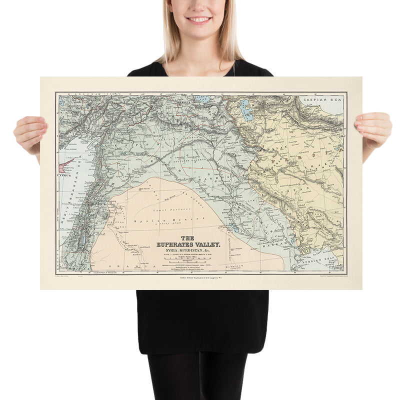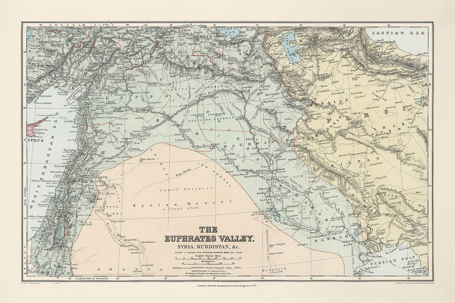 A sweeping portrait of the great river corridor, The Euphrates Valley, Syria, Kurdistan &c. traces the entwined courses of the Euphrates and Tigris from their Anatolian headwaters toward Mesopotamia’s storied plains. With refined full-color lithography and crisp hachures, the map captures the relief of the Taurus and the rugged highlands of Kurdistan as they taper into the steppe and desert. Cities of enduring renown—Aleppo and Damascus in the west, Baghdad and Mosul to the east, with Kirkuk, Arbil (Erbil), Diyarbakir, and Mardin—anchor a landscape where ancient trade routes evolved into modern corridors. The cartography balances physical form with political structure, delineating administrative divisions as they stood in the late Ottoman era, and presenting a meticulously layered view of a region poised between antiquity and modernity.