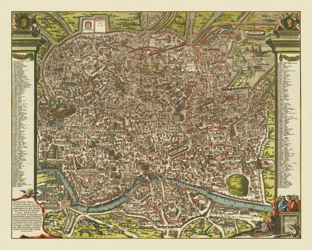 Antigua Mapa Pictórico de Roma Antigua, 1696: Río Tíber, Coliseo, Circo Máximo, Panteón, Foro Romano