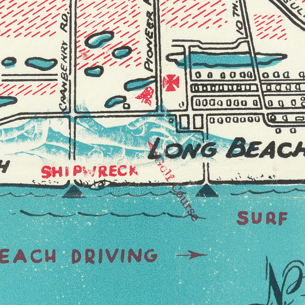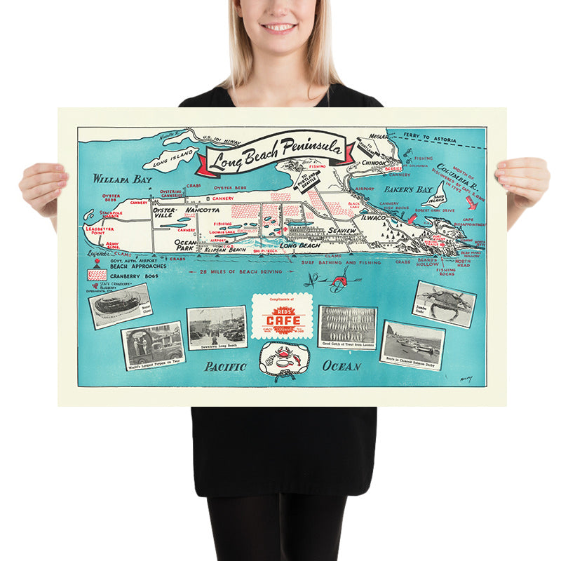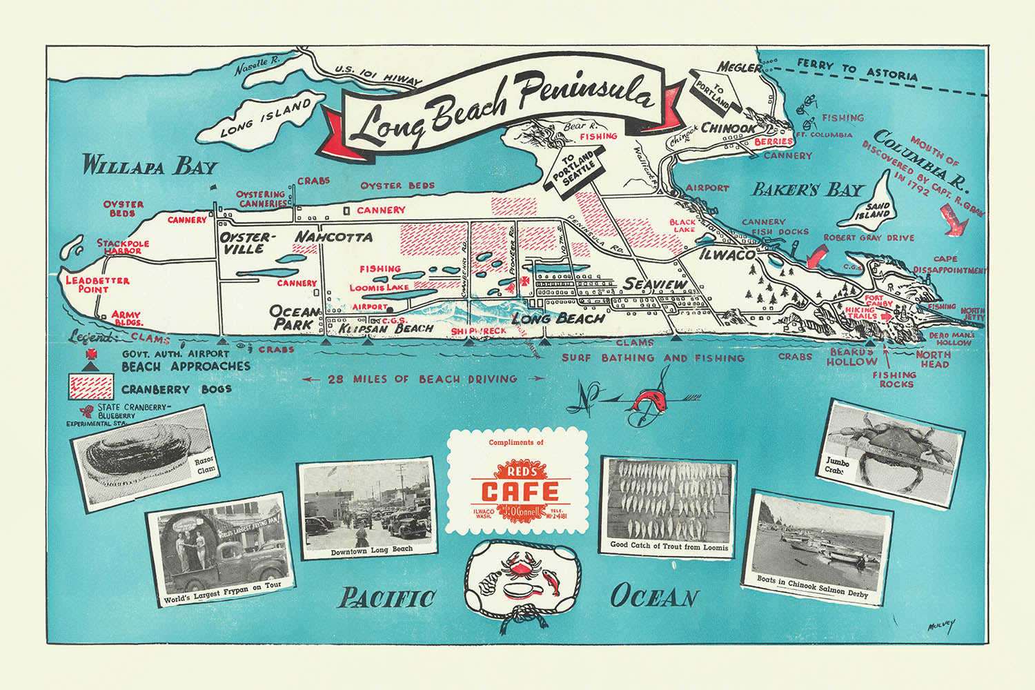 Economy and recreation intertwine on Mulvey’s stage. Cranberry bogs—mapped with care along Cranberry Road—testify to an industry that made this coast famous, just as oyster beds ringing Willapa Bay recall Oysterville’s 19th-century heyday. Ilwaco’s fishing docks, clamming grounds, and the surf-casting spots along Kipsan Beach and Long Beach proclaim a working waterfront that doubles as playground. Photographs punctuate the sheet, while a jaunty advertisement for Red’s Cafe at the peninsula’s south end captures midcentury boosterism and the map’s deft integration of commerce into cartography. This is a city map by other means: it inventories livelihoods as precisely as streets, showing how harvests, tides, and tourists move through the same spatial grid.