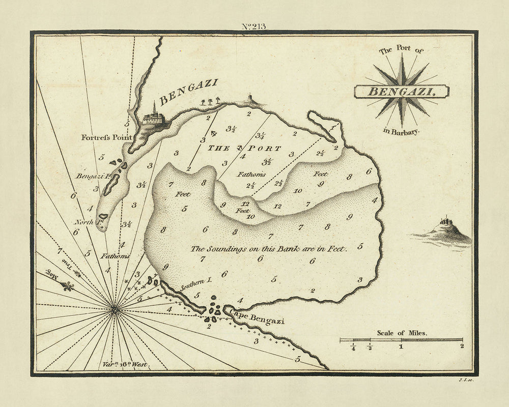 Centrado en el bullicioso puerto de Bengasi, el mapa no solo cartografía la costa inmediata, sino que también se extiende para abarcar las regiones circundantes, incluyendo el Golfo de Sidra y la ciudad de Derna. Marcadores geográficos notables como Fortres Point, Cabo Bengazi y varias islas pequeñas están claramente delineados. Estas características ofrecen un vistazo a la importancia estratégica marítima y militar de Bengasi durante principios del siglo XIX, un período marcado por intensa actividad marítima y maniobras geopolíticas en el Mediterráneo.