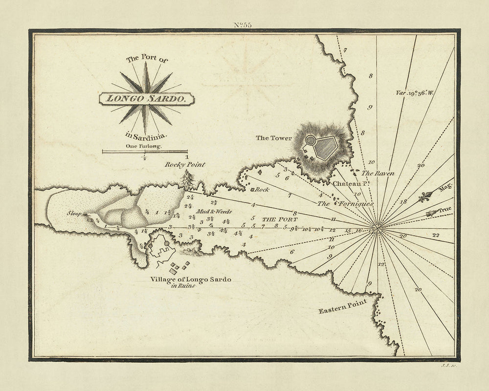 Más allá de su utilidad para la navegación, la carta es un rico tapiz de la topografía y los detalles náuticos del área. Marca importantes características marítimas y terrestres como Rocky Point, Mud and Weeds y The Fornigues. En particular, también detalla el pueblo de Longo Sardo en ruinas, proporcionando un contexto histórico de los asentamientos pasados de la región. La Torre de Longo Sardo, otro elemento destacado, es probablemente una referencia a una torre de vigilancia costera, que hace alusión a las estrategias defensivas históricas de la región contra invasores o piratas.