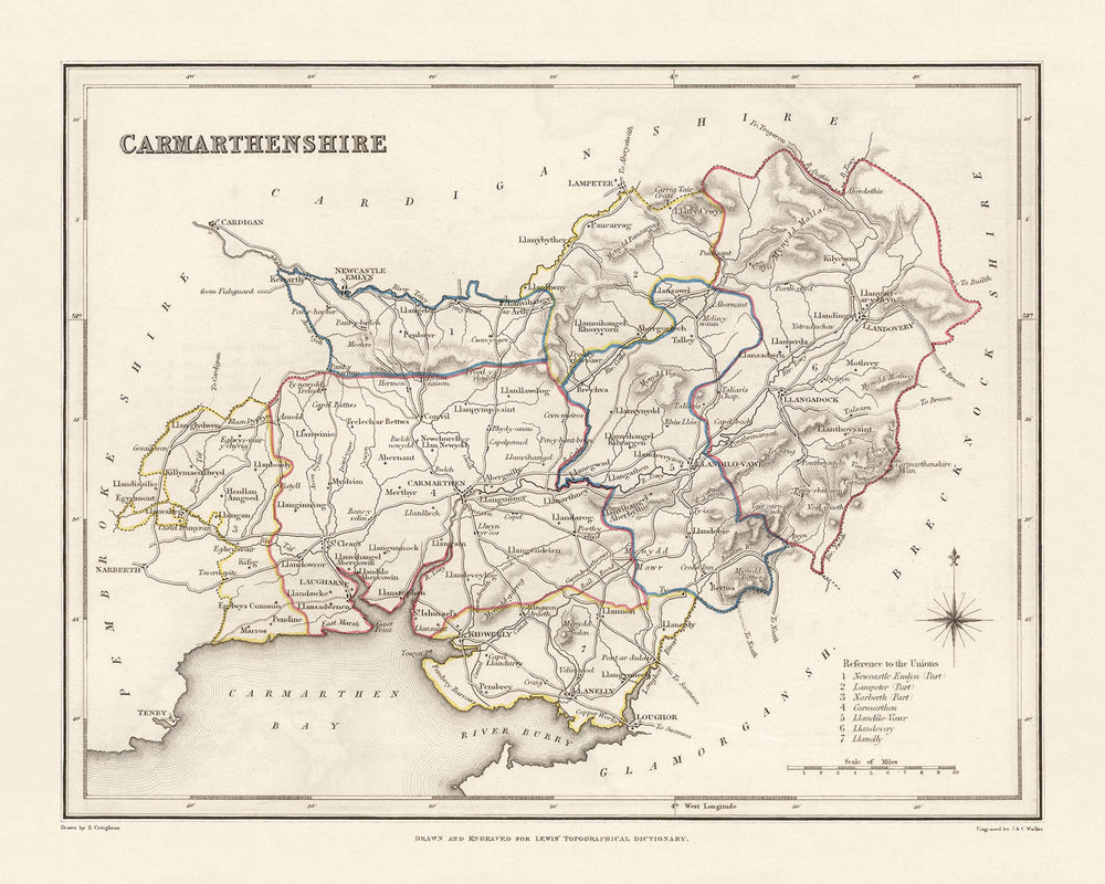 Carmarthenshire County, published by Samuel Lewis and Co. in 1844 for the Atlas to the Topographical Dictionaries of England and Wales, distills a rich Welsh county into a deft marriage of scholarship and artistry. Lewis’s signature clarity guides the eye from the tinted administrative boundaries to the fine hachures that breathe life into hill and valley. An elegant compass rose orients north to the upper right, a gentle reminder that perspective is part of the cartographer’s craft. Towns and ports—Carmarthen, Llanelli, Llandeilo, Ammanford, Burry Port, and the bilingual Cydweli/Kidwelly—stand in dialogue with the roads, nascent railways, bridges, and landmarks that connected them. The result is a concise panorama of mid-19th-century Wales: politically precise, physically evocative, and historically resonant.