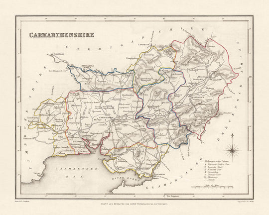 Administration, for Lewis, is cartography’s indispensable skeleton. The county boundary is crisply resolved against neighboring shires, while internal divisions are articulated in varied washes that differentiate districts and parishes with intuitive ease. References to unions—particularly those centered on Carmarthen, Llandilo, and Llanelli—anchor the map in the post-1834 Poor Law framework, when local governance, relief, and record-keeping were reorganized along new, often overlapping lines. This layered approach clarifies how ecclesiastical, civil, and welfare jurisdictions intersected in daily life, from the maintenance of bridges and roads to the registration of births and marriages. The map thereby serves not only the traveler and historian but the genealogist and legal mind, translating bureaucracy into legible color and form.