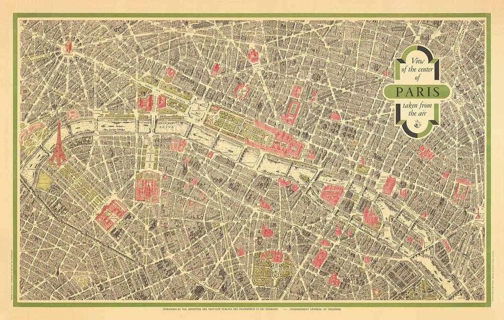 Ah, el mejor mapa hechas de París, juntado por Georges Peltier en 1950. Este es un mapa de pájaros de París, o, como afirma el mapa, "una vista del centro de París, tomada del aire".