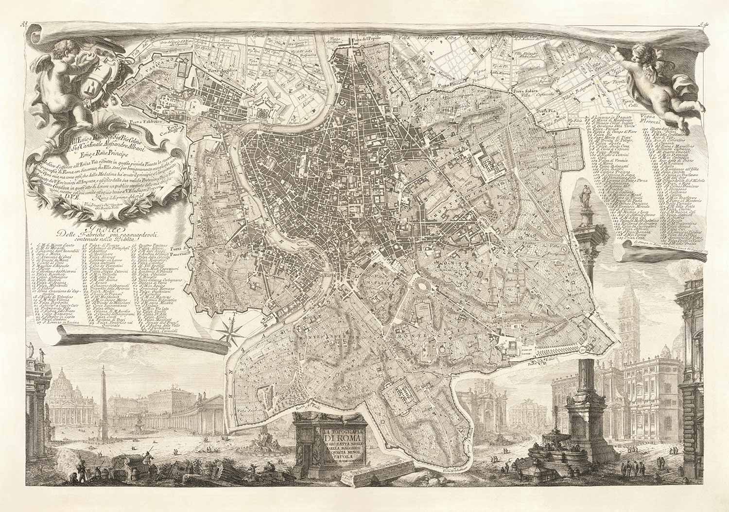 En la parte inferior izquierda y derecha hay grabados realmente impresionantes de la Basílica de San Pedro y de la fachada de la Basílica de Santa Croce in Gerusalemme, de la Fontana di Trevi y de Santa Maria Maggiore, entonces las mejores realizaciones arquitectónicas de la Roma del siglo XVIII.