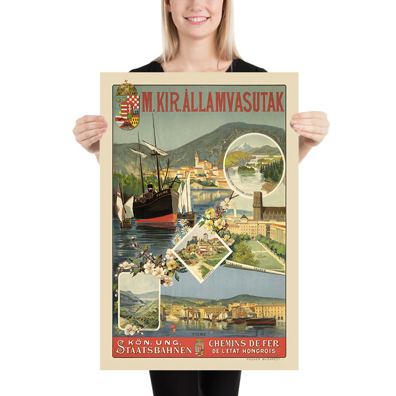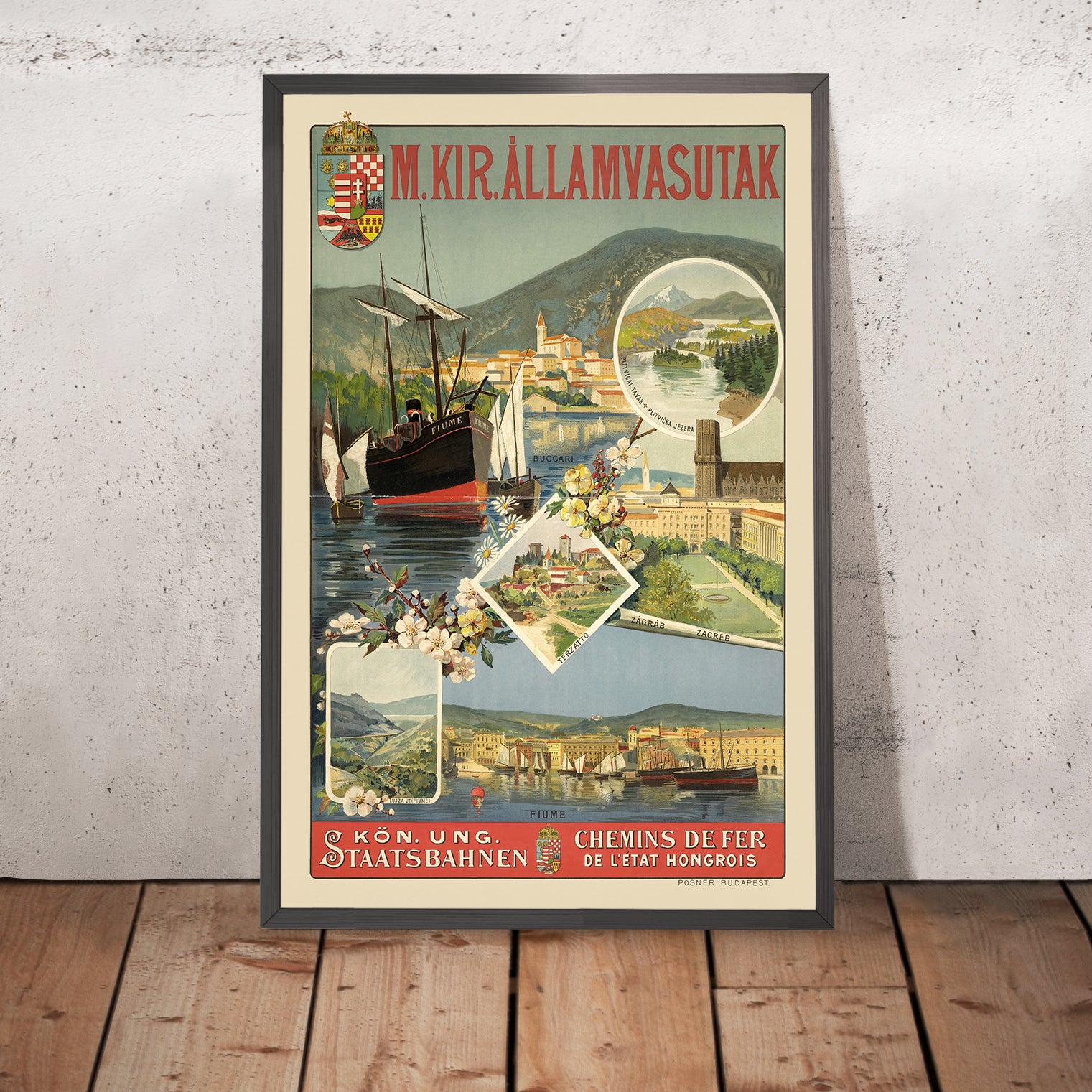 Rijeka Travel Poster: Fiume – Buccari – Zagreb by Royal Hungarian State Railways, 1890