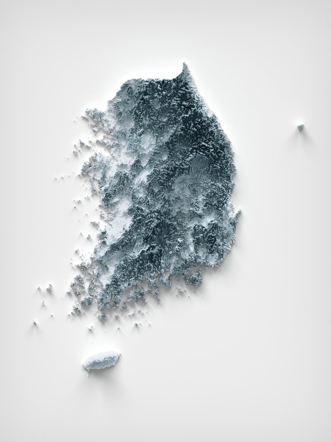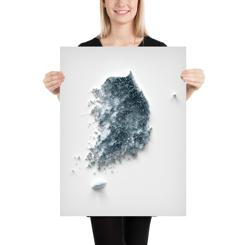 This is a minimalist topographical relief map of South Korea, created by The Unique Maps Co. and enhanced with our trademarked Unique 3D process. There are no labels, no roads, and no towns — just the pure shape of the land. Subtle light and shadow rake across the surface to spotlight high ridges, cradle deep river corridors, and trace the finely serrated coastlines that make the peninsula so distinctive.
