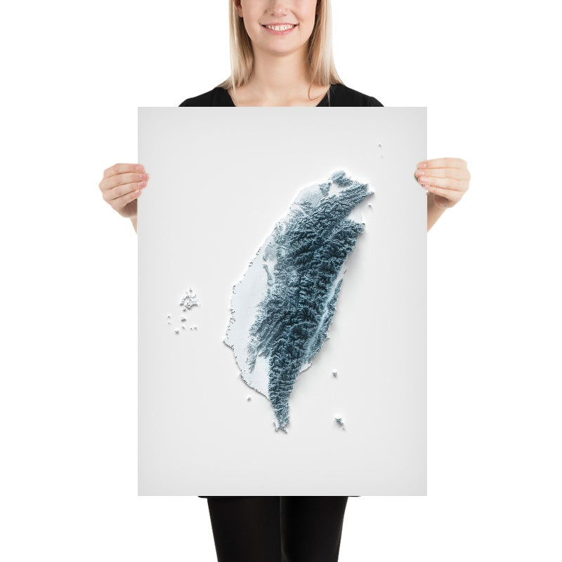 This is a minimalist topographical relief map of Taiwan, created by The Unique Maps Co. and enhanced with our trademarked Unique 3D process. There are no labels, no roads, and no towns—only the island’s contours and forms. Careful use of light and shadow brings the landscape to life: high ridgelines gleam where they catch the light, deep gorges sit in crisp shadow, and the great lowland plains register as smooth, gentle gradients.