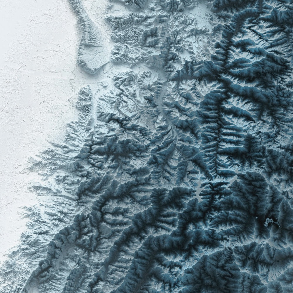 Our shaded relief prints use ultra high resolution topographic data and a secret 3D rendering process to create the illusion of raised terrain — like the mountains are about to lift right off the page. No labels, no borders, no distractions. Just the raw shape of the land, brought to life in a clean, modern style.