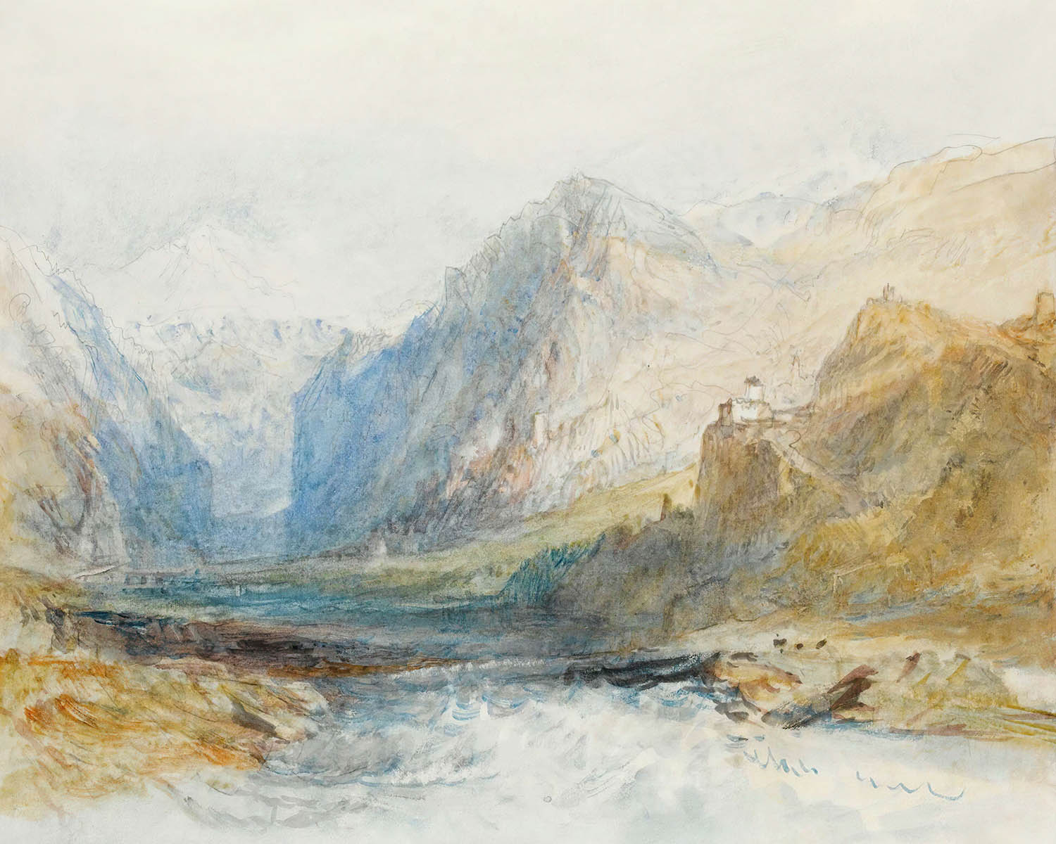 The Domleschg Valley, in Switzerland’s canton of Graubünden, unfurls here toward the gorge at Rothenbrünnen—a gateway-like passage where river, slope, and sky interlock. Turner privileges mood over meticulous contour, inviting the viewer to feel the cool river air and the hush that precedes a change in weather. This emphasis on fleeting effects looks ahead to Impressionism, where truth resides in perception rather than precision.