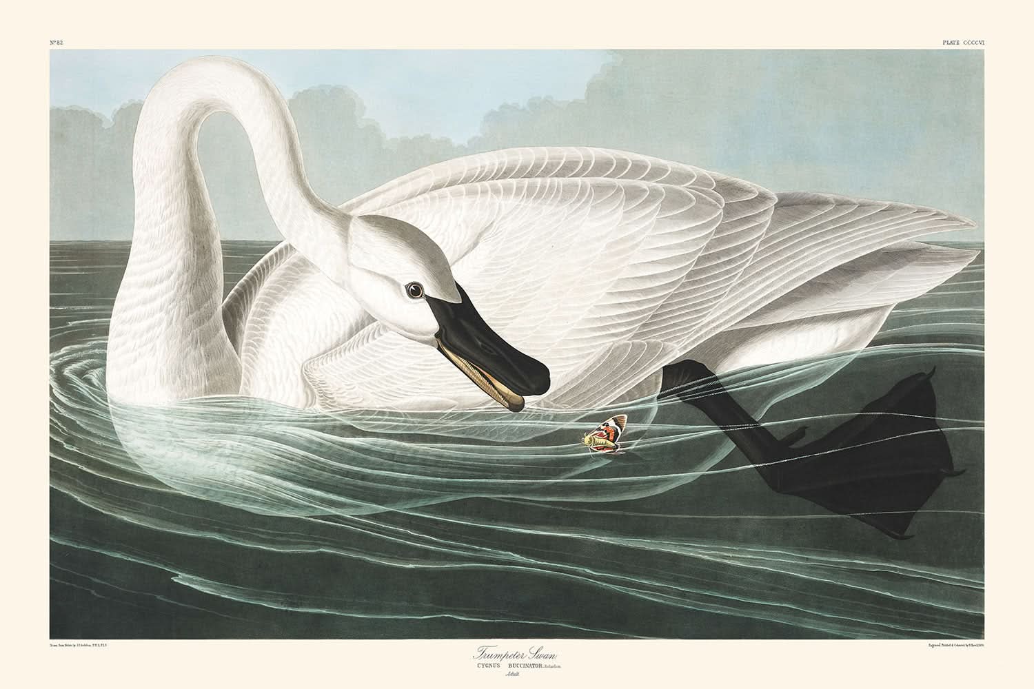 El grabado del cisne trompetero destaca por su importancia histórica y sus intrincados detalles. Existen pocos registros que rastreen la historia de los cisnes americanos de manera eficaz: es un reino de misterio que fusiona la poesía y el enigma de la naturaleza. El trabajo de Audubon fue un intento de desentrañar estos misterios, ya que observó y notó meticulosamente que C. Buccinator, el cisne trompetero, frecuentaba lugares específicos dentro del área de distribución más al sur de América del Norte durante el invierno. Esta representación específica captura la pureza blanca como la nieve del plumaje del cisne adulto que se refleja en los sutiles matices atmosféricos, armonizando con la belleza fugaz de la serenidad de la naturaleza.