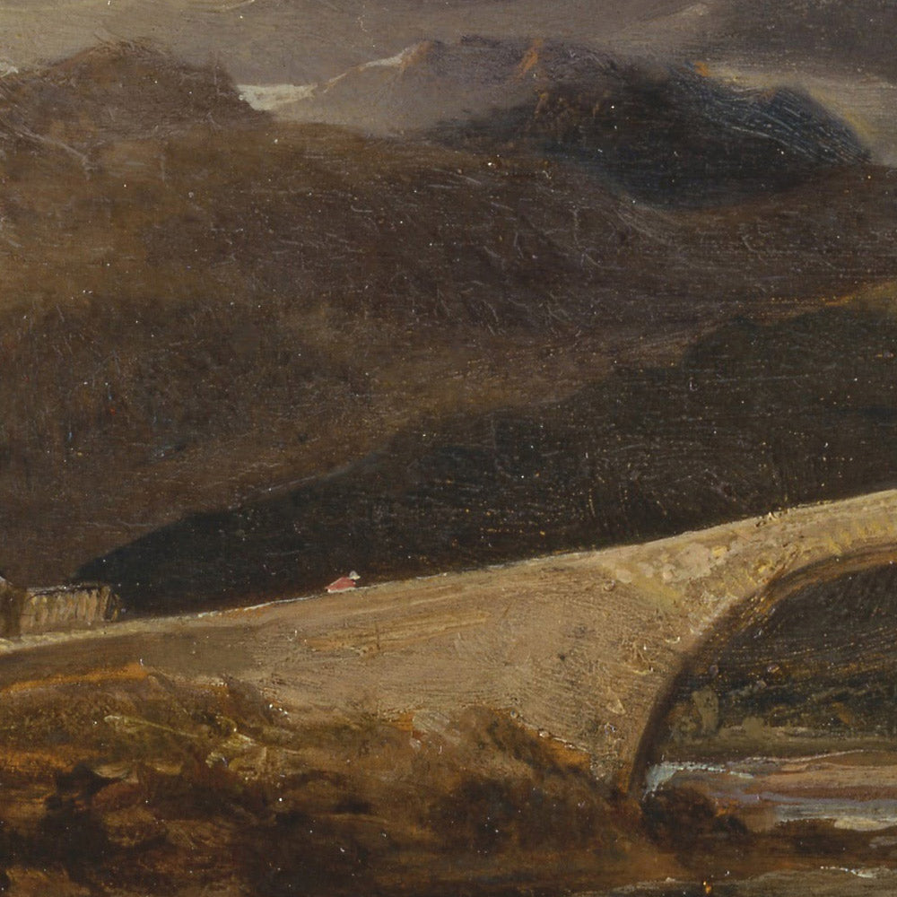 In this work, the bridge and cottage speak to everyday rural life, yet the composition places them within nature’s vast, untamable stage—a core Romantic idea. The arched masonry stands as a deliberate counterpoint to the jagged slopes and restless sky, reminding us how human craft knits communities together while yielding to the drama of the land. The mood is contemplative rather than grandiose, a tender Highland vignette radiating quiet strength.