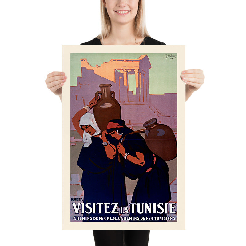 “Dougga. Visitez la Tunisie” by Joseph de La Nézière is a luminous 1929 Art Deco travel poster inviting visitors to the ancient hilltop city of Dougga in northern Tunisia. Designed for the Paris–Lyon–Méditerranée railway and the Tunisian Railways, it marries antiquity with everyday life: two women in traditional dress stride across the foreground with amphorae balanced on their shoulders while the colonnaded ruins of Dougga’s Roman Capitol rise behind them. The artist’s signature, “J. de La Nézière 1929,” appears at the upper right, and the bold title VISITEZ LA TUNISIE anchors the composition in classic shaded lettering.