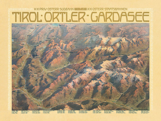 K. K. Priv. Österr. Südbahn. K.K. Österr. Staatsbahnen. Tyrol. Ortler. Gardasee, first published in 1908, is a sumptuous Alpine travel poster that blends cartography and art in the spirit of the Jugendstil era. Created for the Imperial-Royal Austrian Southern Railway and the Imperial-Royal Austrian State Railways, this decorative landscape map invites the viewer to trace the route from the Tyrol’s high country around the Ortler massif down toward the sunlit shores of Lake Garda. Its warm, earth-toned palette and elegant typography capture a moment when rail travel opened the Alps to modern tourism, promising grand scenery and effortless connection.