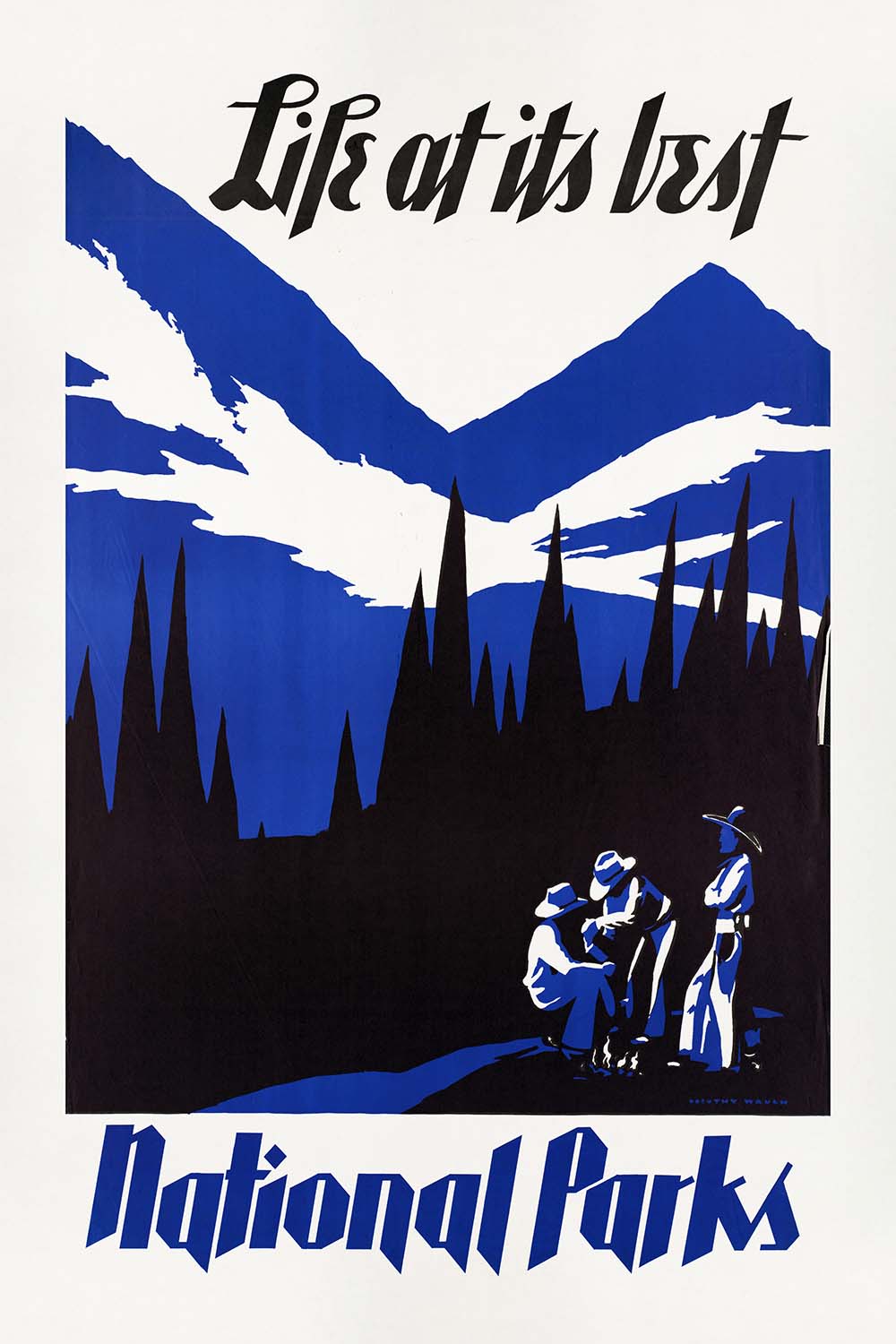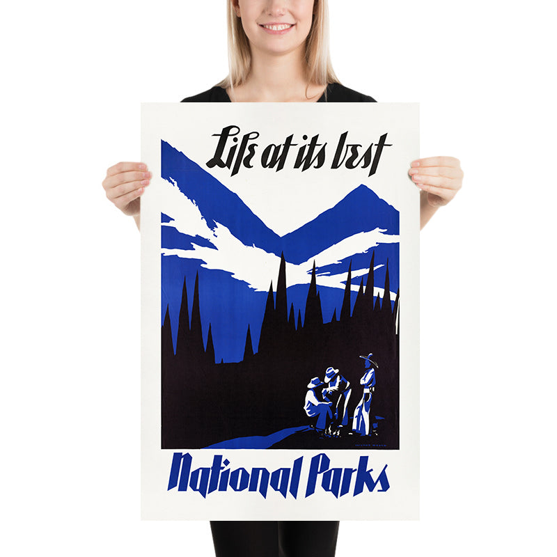 “Life at its best. National Parks” by Dorothy Waugh (1930) is a striking Art Deco travel poster created at the dawn of America’s love affair with its great outdoors. Designed to inspire journeys across the United States’ national parks, it distills mountain grandeur, clean air, and the promise of adventure into a bold, modern graphic. Issued at a time when outdoor recreation and conservation were becoming central to American identity, Waugh’s composition marries optimism with clarity—urging travelers to lace up their boots and discover the country’s most treasured landscapes.