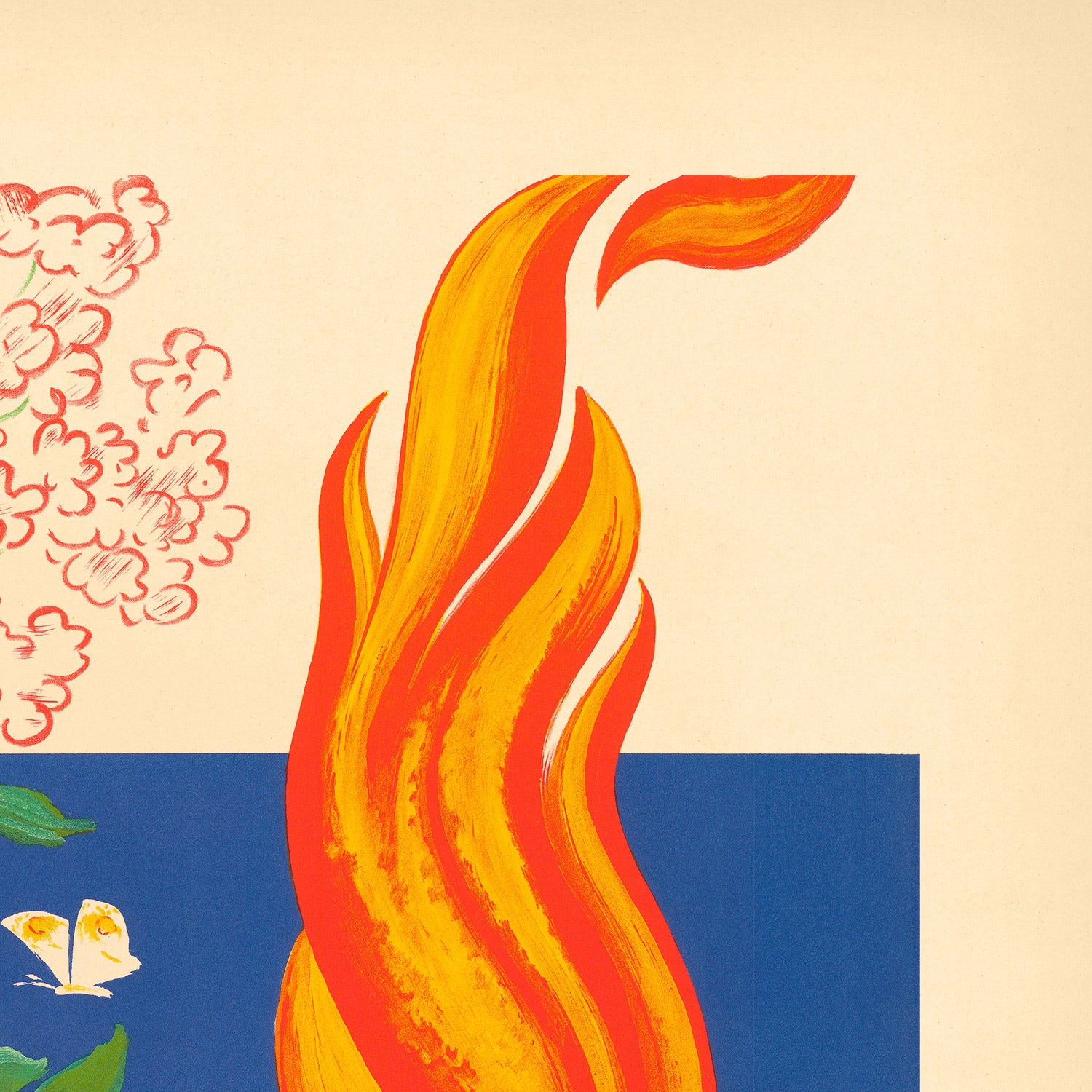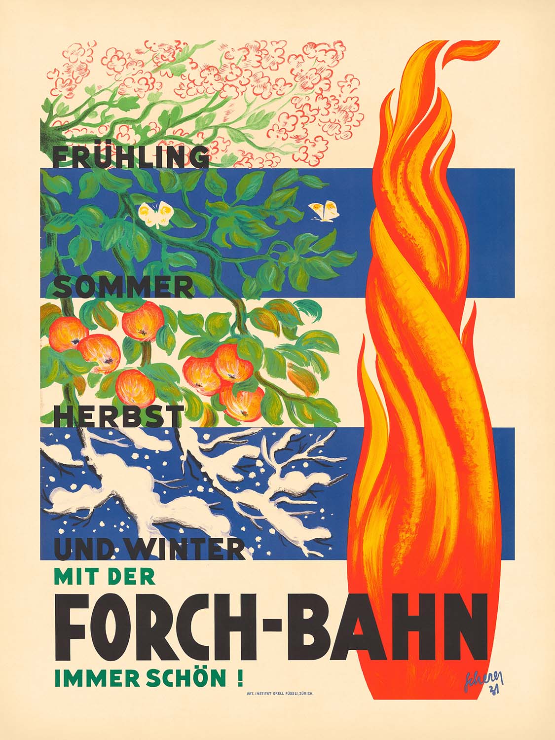Design and color: Dominated by cool blues and fresh greens, with vibrant accents of orange, the palette captures the rhythm of the seasons—blue for alpine air and distant lake light, green for flourishing hillsides, and orange for autumnal warmth and the poster’s central flame-like motif. Scherer’s clean, sans-serif lettering anchors the image, while floral and fruit details lend organic texture. The seasonal panels are juxtaposed with striking economy, creating a brisk visual pace that mirrors the ease of rail travel. It’s an eloquent blend of Swiss graphic clarity and expressive color—equally at home in modern, eclectic, or vintage-inspired interiors.