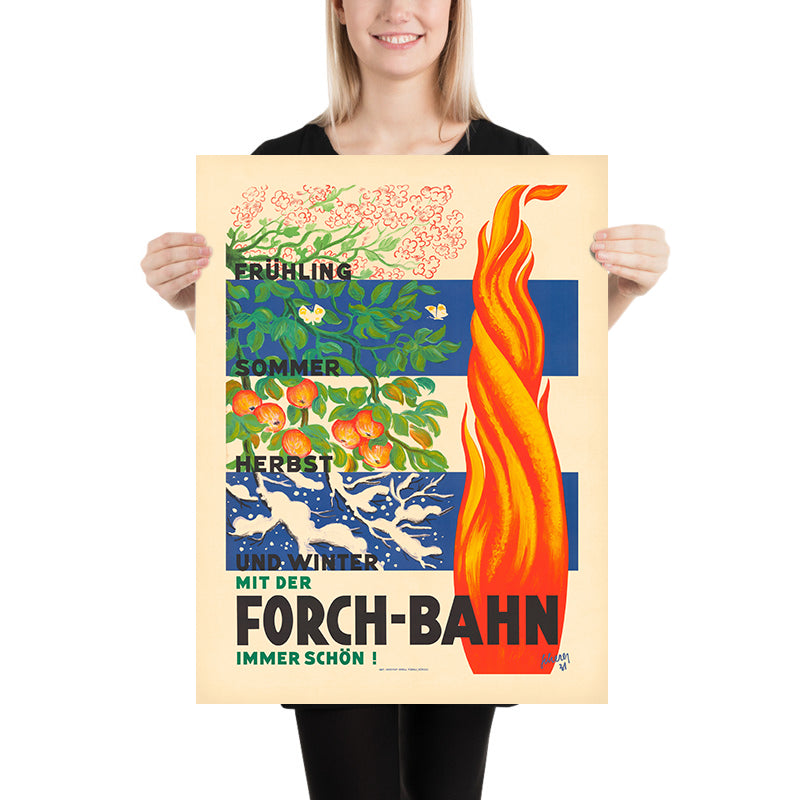 Frühling, Sommer, Herbst und Winter – mit der Forch-Bahn immer schön! by Carl Scherer is a spirited 1931 Swiss travel poster celebrating the light railway that serves the green hills east of Zürich. Designed at the height of interwar modernism, the poster invites year-round escapes on the Forch-Bahn, presenting the seasons as a seamless journey from blossom to snow. Scherer’s composition blends confident typography with vivid imagery, distilling the romance of regional travel into a crisp, contemporary statement that still feels fresh nearly a century later.