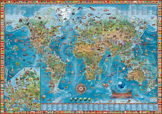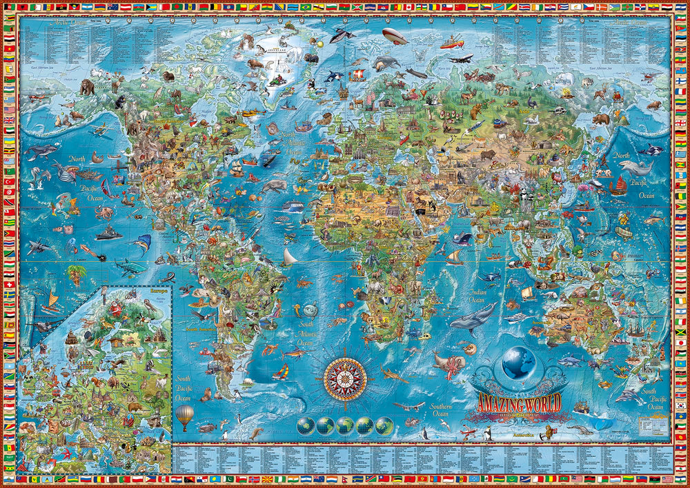L’une des caractéristiques les plus frappantes de cette carte est sa capacité à impliquer et à éduquer simultanément. L'inclusion de monuments historiques et culturels, tels que les merveilles du Moyen-Orient et les animaux majestueux d'Afrique, fournit une riche mosaïque d'informations qui peuvent susciter la curiosité et inspirer l'apprentissage. La carte de l'Europe en médaillon dans le coin inférieur gauche et les illustrations du globe en bas renforcent encore la valeur éducative de la carte, offrant des perspectives supplémentaires sur la géographie du monde.