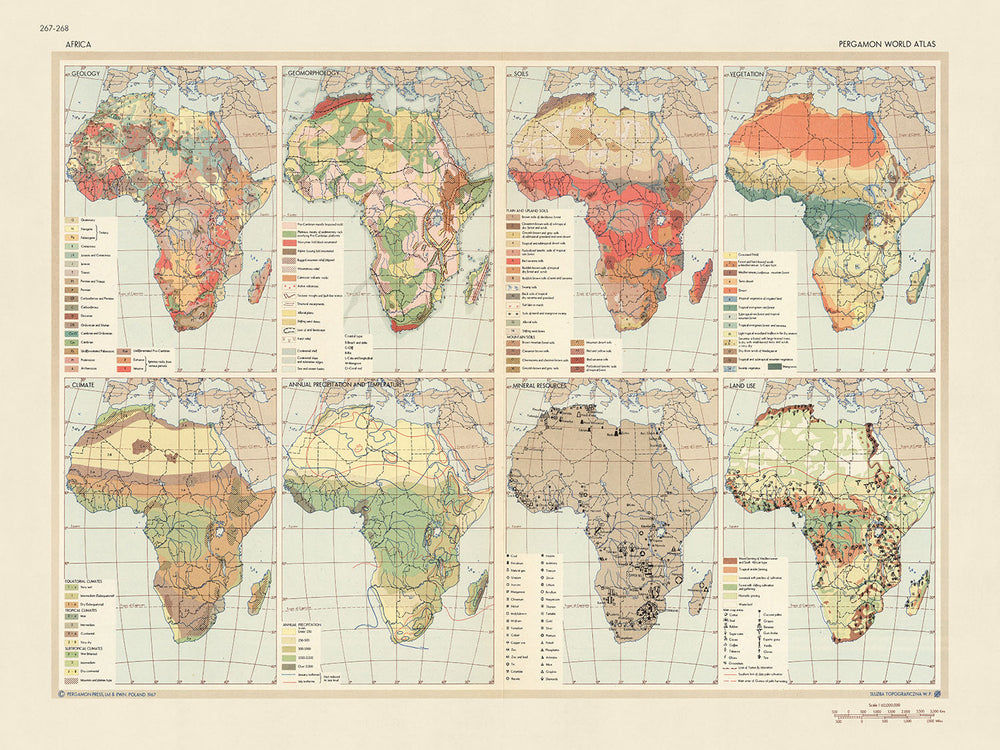 La carte est remarquable par ses huit infographies distinctes mais interconnectées, chacune mettant en lumière un aspect différent de la géographie de l'Afrique. Ces infographies couvrent un large éventail de sujets, de la géologie et géomorphologie aux sols, à la végétation et au climat. Chaque infographie est méticuleusement détaillée, fournissant une richesse d'informations qui permet au spectateur d'acquérir une compréhension approfondie des diverses caractéristiques géographiques de l'Afrique. Les infographies sur les précipitations annuelles et la température sont particulièrement remarquables, offrant un aperçu fascinant de la diversité climatique de l'Afrique.