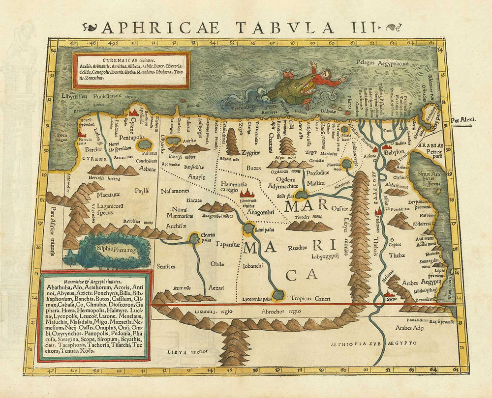 Cette merveilleuse ancienne carte de l'Afrique du Nord a été publiée pour la première fois en 1545. Elle a été créée par Sebastian Munster.