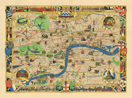 La carte vous montre toutes les choses intéressantes qui se passaient à Londres dans le cadre du Festival, ainsi que les lignes de métro à emprunter pour y arriver. Il y a aussi un tas de portraits et de vignettes montrant diverses personnes célèbres et des monuments.