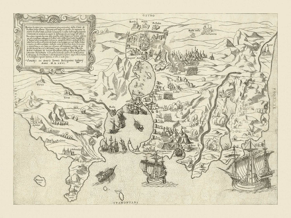 L'art de Zaltieri est évident dans les illustrations détaillées des camps militaires et des batailles navales, donnant vie à la tension et au drame du siège. La carte est basée sur l'œuvre rare d'Agostino de Musi, offrant une représentation thématique du triomphe de la flotte chrétienne. La représentation de puissants navires, tels que le galion portugais São João Baptista, souligne la puissance navale qui était cruciale pour briser le bastion ottoman. Cette carte témoigne des manœuvres stratégiques et des alliances qui ont défini cette victoire historique.