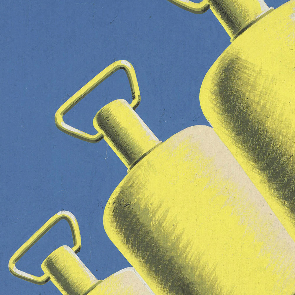 Design and color: The palette—cobalt to slate blues, sunflower‑yellow highlights, and grounding blacks—evokes clear skies and bright southern light while keeping a resolutely modern mood. Clean, sans‑serif lettering, generous negative space, and graphic contrast make the composition read beautifully from across a room. It’s a striking statement in industrial‑chic, mid‑century modern, or contemporary interiors, especially kitchens, bars, studios, and lofts where crisp signage‑style art shines.