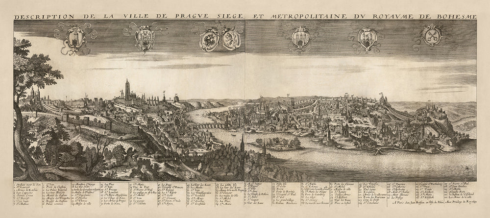 - Présente une belle et grande vue en perspective centrée sur le Pont Charles avec 122 emplacements clés identifiés en français dans la marge inférieure