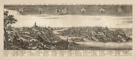 Prague, la capitale du royaume de Bohême, est magnifiquement illustrée sur cette carte, mettant en valeur ses quartiers et ses monuments importants. La vieille ville et le centre commercial sont représentés avec une précision remarquable, mettant en valeur la splendeur architecturale de la ville. Des monuments remarquables tels que la cathédrale Saint-Guy et le château de Prague occupent une place importante, reflétant l'importance historique et culturelle de la ville. La carte présente également diverses portes et fortifications, offrant un aperçu des structures défensives de la ville au cours d'une période tumultueuse de l'histoire européenne.