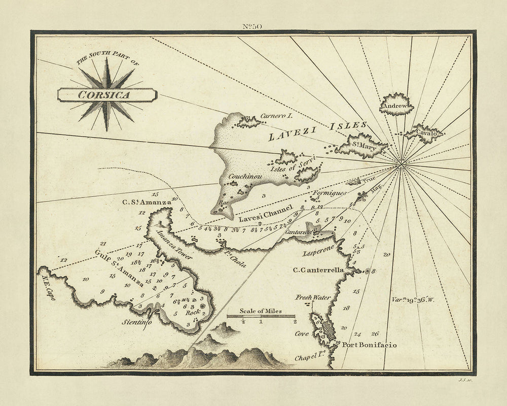 La carte de William Heather est orientée uniquement avec le sud-est en haut, un choix qui met en évidence les routes de navigation stratégiques de l'époque. L'inclusion de sondages (mesures de la profondeur de l'eau) est particulièrement précieuse, reflétant l'utilité de la carte pour les marins naviguant dans les eaux périlleuses de la Méditerranée. De plus, la carte détaille les caractéristiques topographiques telles que les montagnes imposantes et les vastes forêts de Corse, offrant une vue complète qui va au-delà de la simple navigation pour résumer la beauté naturelle de l'île.