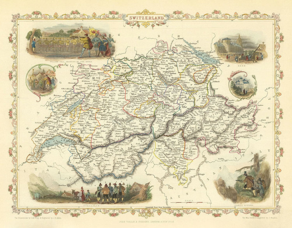 Gravé par John Rapkin et publié par J. Tallis & Co en 1851, ceci est l'une des plus belles et des plus détaillées cartes historiques de la Suisse. Cette carte a été à l'origine colorée à la main il y a plus de 150 ans et a été habilement restaurée par The Unique Maps Co.