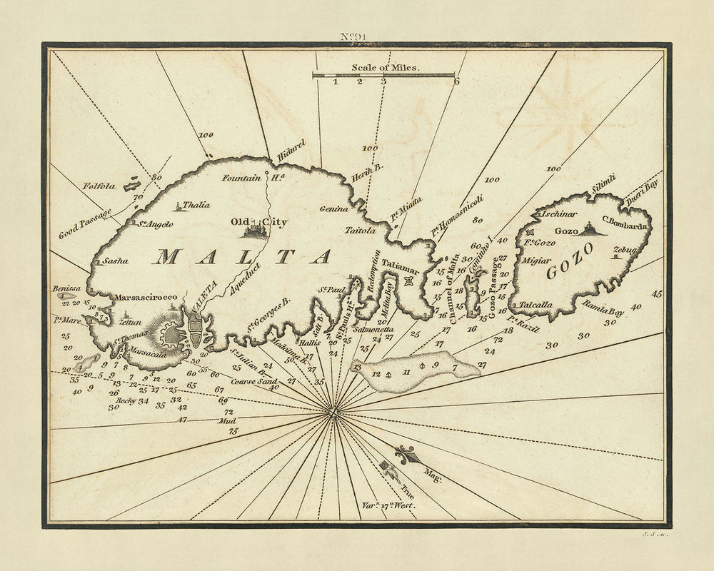 Carte marine du vieux Malte et de Gozo par Heather, 1802 : littoraux détaillés, sondages, rose des vents