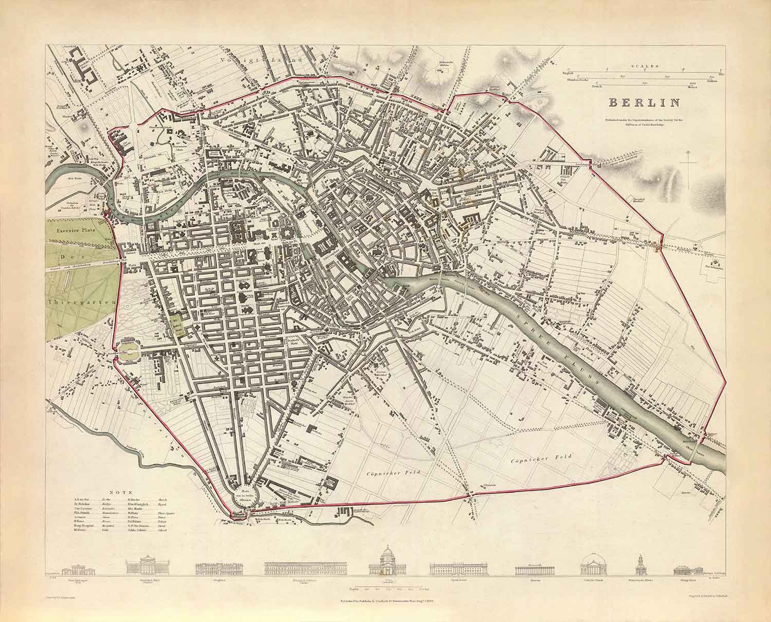 Ancienne carte de Berlin en 1833 par SDUK: Allemagne, Tiergarten, Alexanderplatz, Mur de Berlin, Porte de Brandebourg