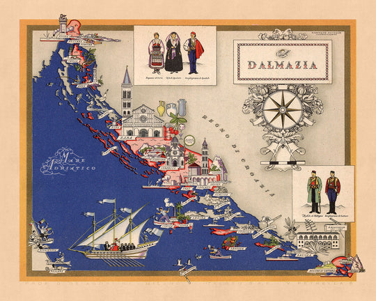 Cette carte de la région italienne de Dalmatie, publiée à l'origine en 1938 par la société cartographique italienne, Istituto Geografico De Agostini, est un bel et détaillé exemple de carte thématique et picturale. La carte couvre l'ensemble de la région de Dalmatie, qui est située le long de la côte est de la mer Adriatique et comprend les pays modernes de Croatie, de Bosnie-Herzégovine et du Monténégro. Au moment où cette carte a été publiée pour la première fois, la Dalmatie faisait partie du Royaume d'Italie.