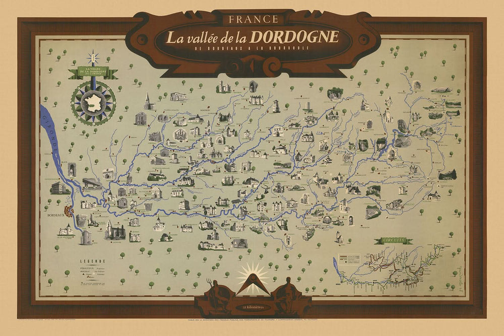 La carte intitulée « La Vallée de la Dordogne de Bordeaux à la Bourboule » est une œuvre captivante réalisée en 1948 par l'éminent Jean Moles pour le ministère français du Tourisme. Cette carte n'est pas seulement une représentation géographique, mais une tapisserie vibrante du riche patrimoine culturel et historique de la région de la Dordogne. Elle a été conçue à une époque charnière de la France d'après-guerre, dans le but de rajeunir le tourisme et de célébrer la beauté pittoresque et la profondeur historique de cette région enchanteresse. Les illustrations et symboles complexes de la carte donnent vie aux centres administratifs, aux merveilles naturelles et aux monuments historiques qui définissent la Dordogne.
