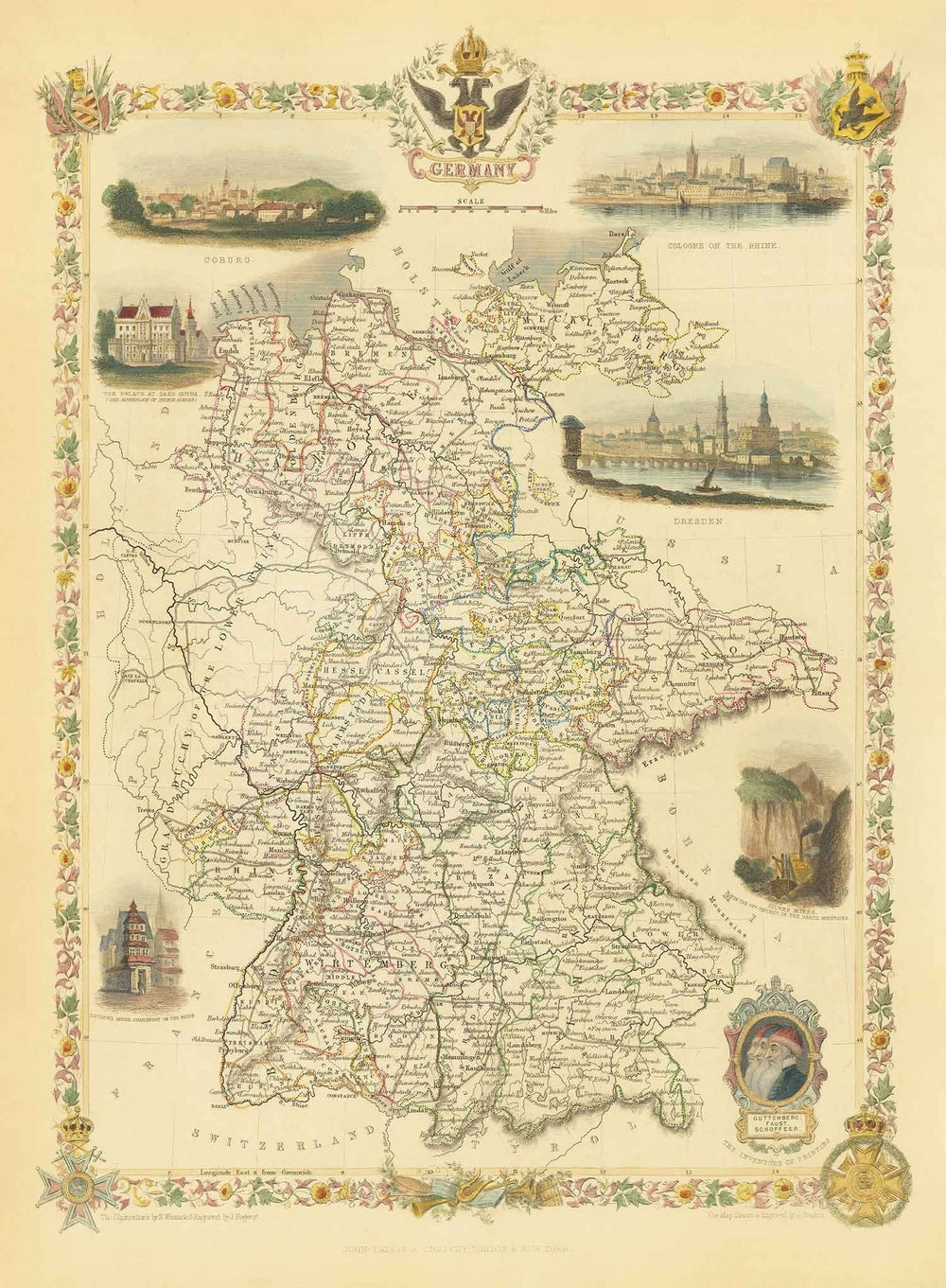 Gravé par John Rapkin et publié par J. Tallis & Co en 1851, c'est l'une des plus belles et des plus détaillées cartes historiques de l'Allemagne.