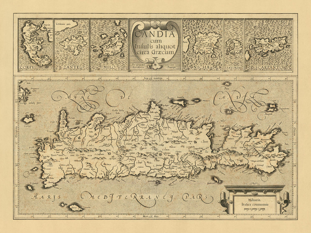 Gerhard Mercator, célèbre pour sa projection révolutionnaire de Mercator, apporte son expertise dans cette représentation époustouflante de la Crète. Son œuvre n'est pas seulement une représentation géographique, mais un document historique qui reflète le paysage politique et culturel de l'époque. La carte comprend des cartes en encart de Corfou, Zante, Milo, Nicsia, Santorin et Scarpanto, chacune rendue avec la même précision et le même soin, offrant une vue complète des îles de la région.