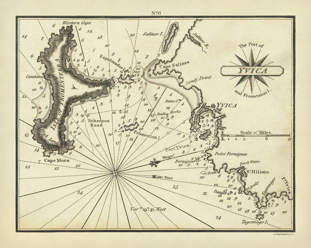 Ancienne carte d'Ibiza par Heather, 1802 : ville d'Ibiza, Saint-Hiliare, port d'Yvica, Fromenterra, îles Baléares