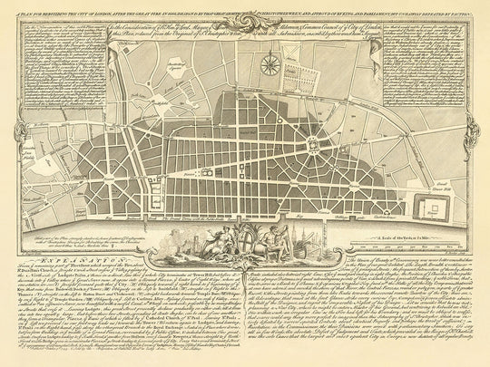 • La carte est intitulée "Un plan pour reconstruire la ville de Londres après le Grand Incendie en 1666 ; conçu par ce grand architecte Sr. Christopher Wren ; et approuvé par le roi et le parlement, mais malheureusement contrecarré par des factions."