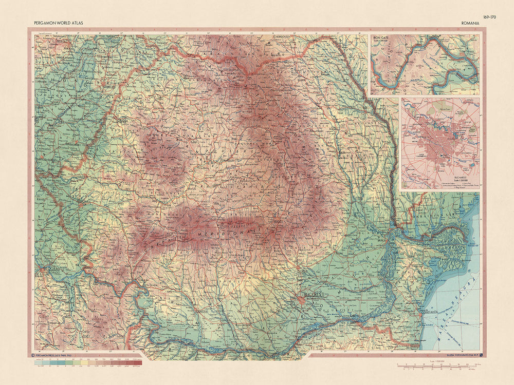 Cette carte de la Roumanie de 1967, publiée par le service topographique de l'armée polonaise, est une carte politique et physique détaillée qui donne un aperçu complet de la géographie et du paysage politique du pays. La carte se concentre principalement sur la Roumanie, avec ses frontières clairement délimitées et ses principales villes, villages et caractéristiques physiques bien en évidence. La carte comprend également des encadrés de la Porte de Fer et de Bucarest, fournissant des détails supplémentaires sur ces zones importantes.