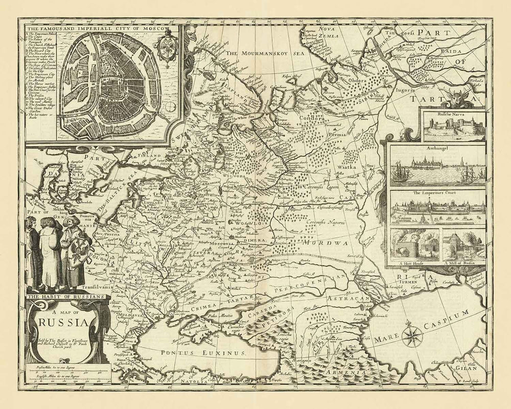 Dans le coin supérieur gauche se trouve une carte très détaillée de Moscou - une vue très rare du 17ème siècle. À l'époque où cette carte a été réalisée, Pierre le Grand venait de devenir l'Empereur de Russie, et le pays s'étendait désormais de la Baltique à l'est jusqu'au Pacifique à l'ouest, ce qui en faisait de loin le plus grand pays du monde - et aussi l'un des moins densément peuplés.