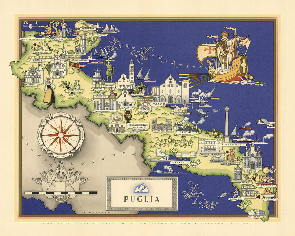 Cette carte de la région italienne des Pouilles, initialement publiée en 1938 par la société cartographique italienne Giovanni De Agostini, est un exemple magnifique et détaillé de carte thématique et picturale. La carte se concentre principalement sur la région italienne des Pouilles, une région du sud-est de l'Italie, connue pour sa riche histoire, son architecture époustouflante et sa beauté naturelle à couper le souffle.