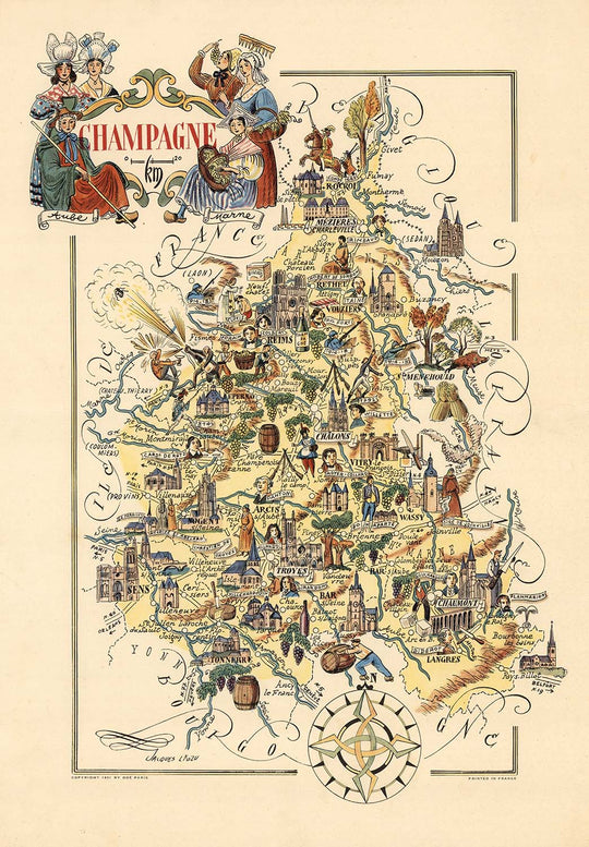 Cette carte est plus qu'une œuvre d'art ; c'est un document historique qui capture l'esprit de la Champagne au milieu du XXe siècle, ce qui en fait un ajout parfait à toute collection, que ce soit pour l'admiration esthétique ou à des fins éducatives.