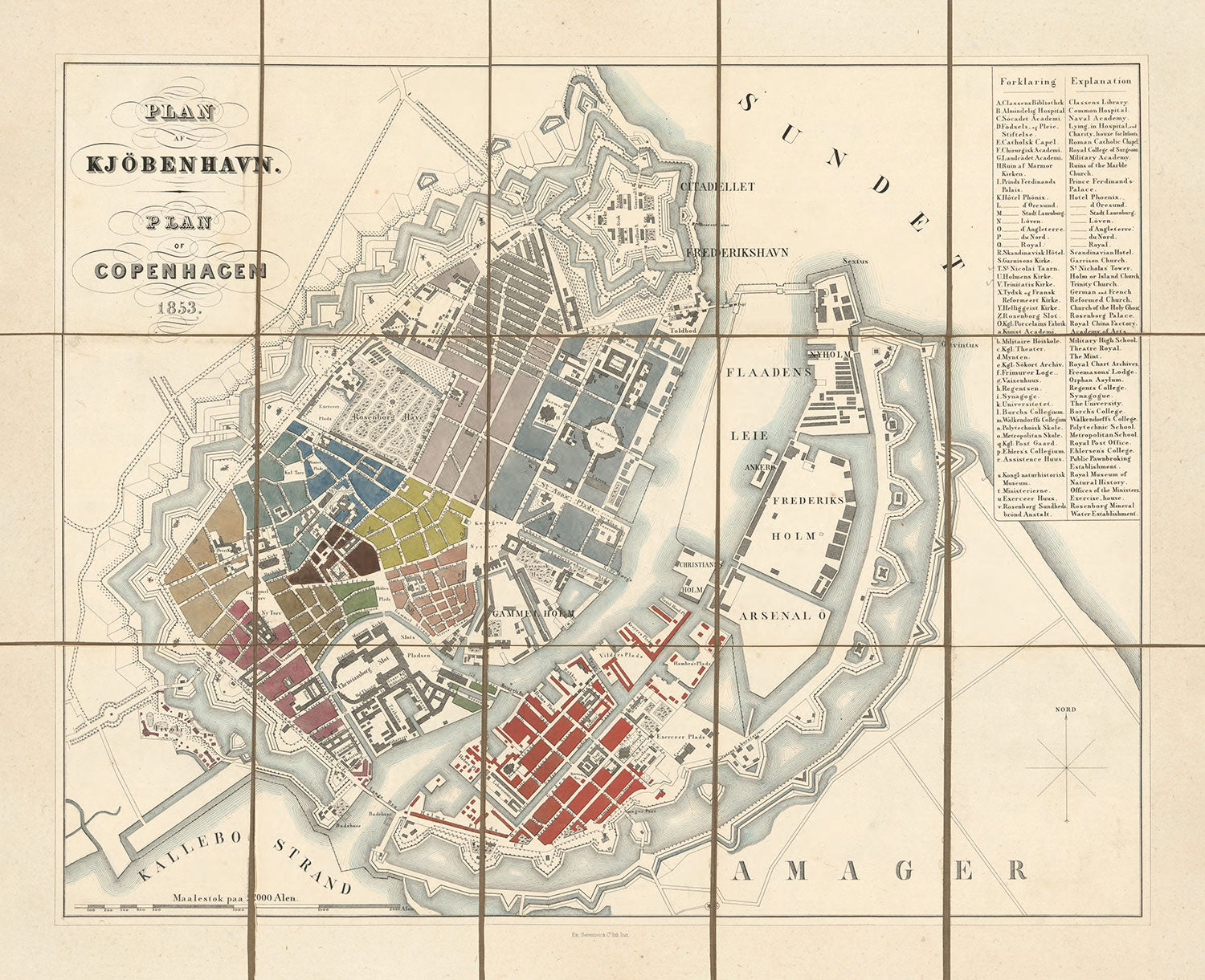 Ceci est une carte de rue colorée de Copenhague, quelques années après que le roi Frederik VII a transformé le Danemark en monarchie constitutionnelle.