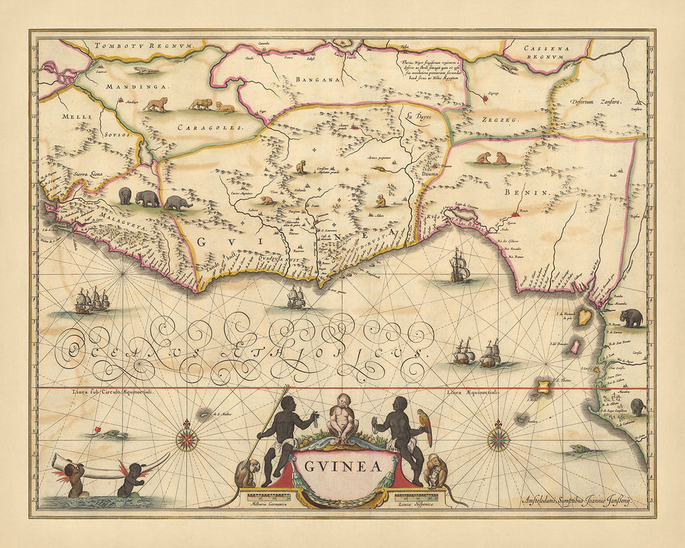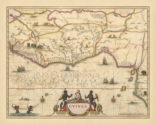 Cette carte est plus qu’un simple artefact historique ; c'est un récit visuel qui invite à l'exploration et à la découverte. Des villes méticuleusement détaillées aux phénomènes naturels magnifiquement représentés, chaque élément sert à transporter le spectateur dans le temps. Que vous soyez un passionné d'histoire, un amateur de cartographie ou que vous appréciiez simplement la beauté des cartes anciennes, cette carte « Guinée » de Nicolaes Visscher II sera certainement un ajout captivant à votre collection.