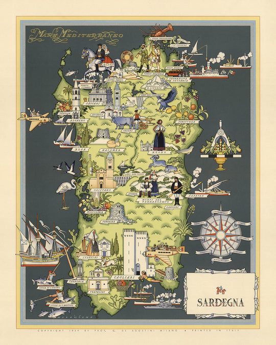 Dans l'ensemble, cette carte témoigne du savoir-faire et du talent artistique de Giovanni De Agostini et offre un aperçu fascinant de la région italienne de la Sardaigne, de sa géographie, de son histoire et de sa culture. C'est un incontournable pour tout collectionneur de cartes anciennes ou toute personne intéressée par l'histoire et la beauté de l'Italie.